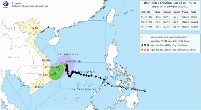 Cụ thể, 7 giờ ngày 1/12, vị trí tâm bão ở vào khoảng 14,7 độ Vĩ Bắc; 111,6 độ Kinh Đông, trên vùng biển phía Tây Bắc khu vực giữa Biển Đông. Sức gió mạnh nhất vùng gần tâm bão mạnh cấp 8 (62-74km/h), giật cấp 10. Di chuyển chậm theo hướng Tây.