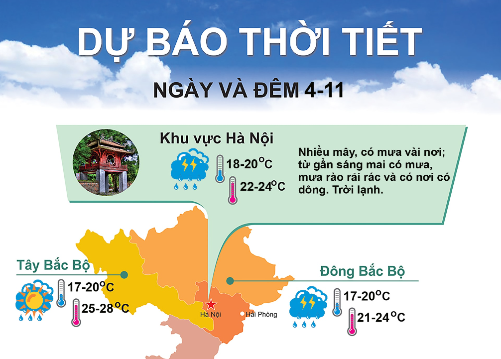 Ngày 4-11, Hà Nội nhiều mây, có mưa vài nơi; từ gần sáng mai có mưa, mưa rào rải rác và có nơi có dông. Gió đông bắc cấp 2-3. Trời lạnh.
