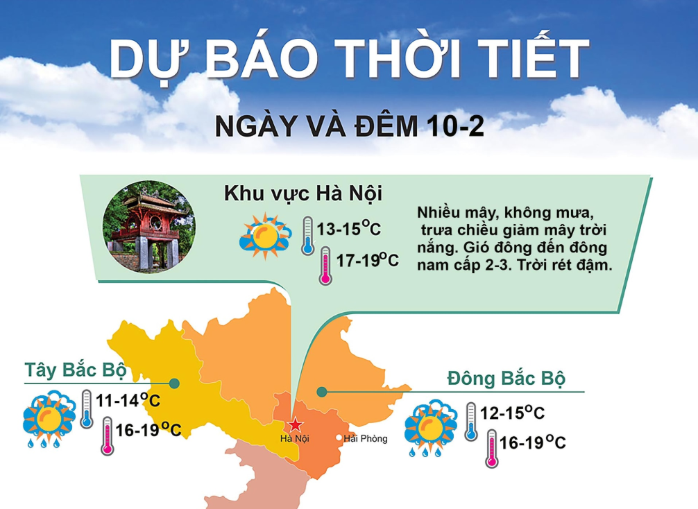 Hôm nay, 10-2, Hà Nội nhiều mây, không mưa, trưa chiều giảm mây trời nắng. Gió đông đến đông nam cấp 2-3. Trời rét đậm.