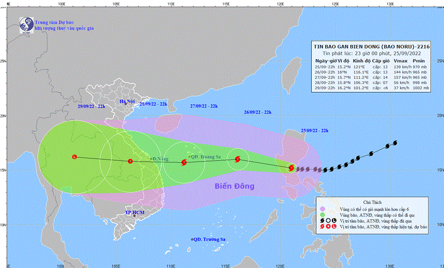 Theo Trung tâm Dự báo khí tượng thủy văn quốc gia, đến 1 giờ ngày 27-9, vị trí tâm bão ở khoảng 16,0 độ Vĩ Bắc; 115,2 độ Kinh Đông, cách quần đảo Hoàng Sa khoảng 350km về phía Đông Đông Nam.