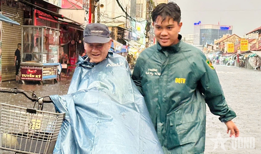 Dân quân phường Thủ Đức, TP Hồ Chí Minh đưa người già qua đoạn đường ngập do mưa lớn. |
