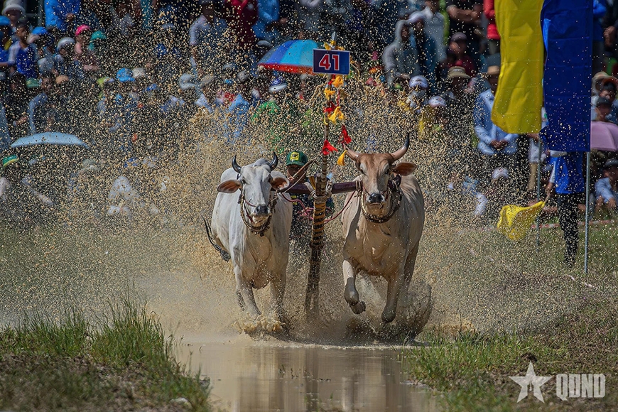 Tiếng nhạc ngũ âm vang, bùn đất tung tóe, mỗi đôi bò bứt tốc là cả sự phối hợp nhuần nhuyễn giữa sức vóc và kỹ thuật điều khiển của nài bò. |