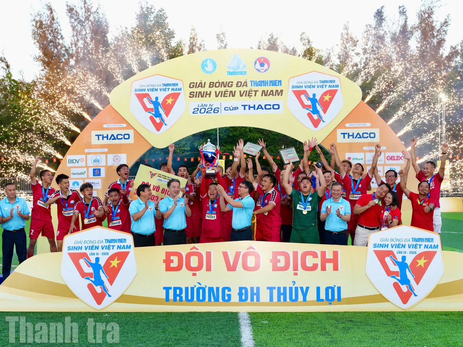 Chiều 22/3, tại sân bóng Trường Đại học Nha Trang, Giải bóng đá Thanh niên Sinh viên Việt Nam lần thứ IV - 2026 Cúp THACO đã khép lại bằng trận chung kết sôi động và lễ bế mạc trang trọng, đánh dấu hai tuần tranh tài hấp dẫn của 12 đội bóng sinh viên đến từ nhiều trường đại học trên cả nước.Trận đấu cuối cùng là màn so tài giữa Trường Đại học Thủy lợi và Trường Đại học Công nghiệp TP.HCM. Trong bầu không khí cổ vũ cuồng nhiệt của đông đảo sinh viên, khán giả, đội bóng Trường Đại học Thủy lợi đã thể hiện sức mạnh vượt trội, giành chiến thắng đậm 4-0 để lên ngôi vô địch một cách thuyết phục. Á quân thuộc về Trường Đại học Công nghiệp TP.HCM; hai đội đồng hạng ba là Trường Đại học Công nghệ TP.HCM và Trường Đại học Công nghệ Đồng Nai.