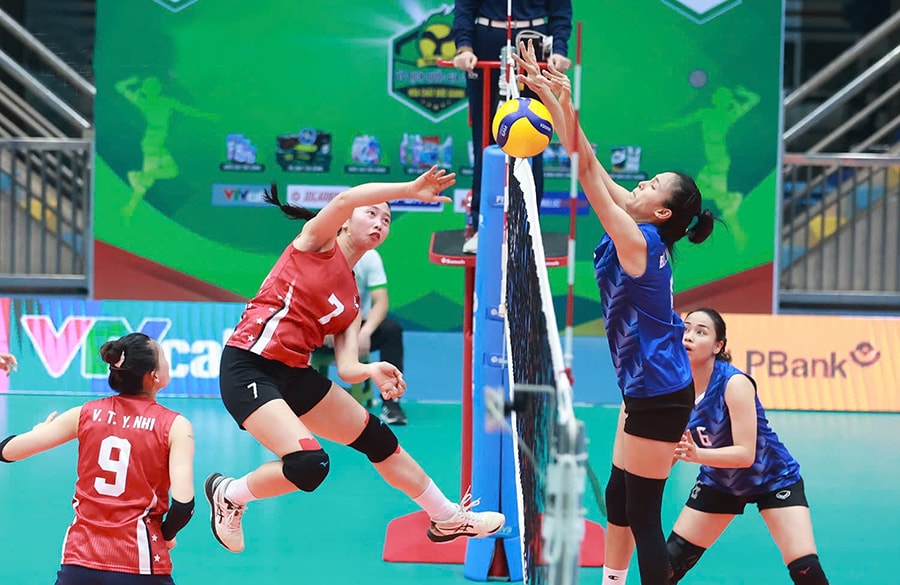 Nhờ sự đồng hành của các nhà tài trợ, Câu lạc bộ Bóng chuyền nữ Hà Nội (áo đỏ) đã có thêm nguồn lực để bứt phá trong cuộc đua thăng hạng. Ảnh: Phạm Bằng