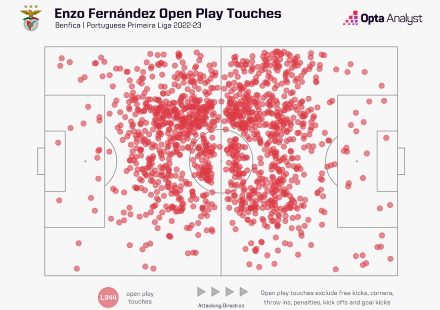 | Thống kê vị trí và số lần chạm bóng của Enzo Fernandez trong màu áo Benfica. Ảnh: Opta Analyst |