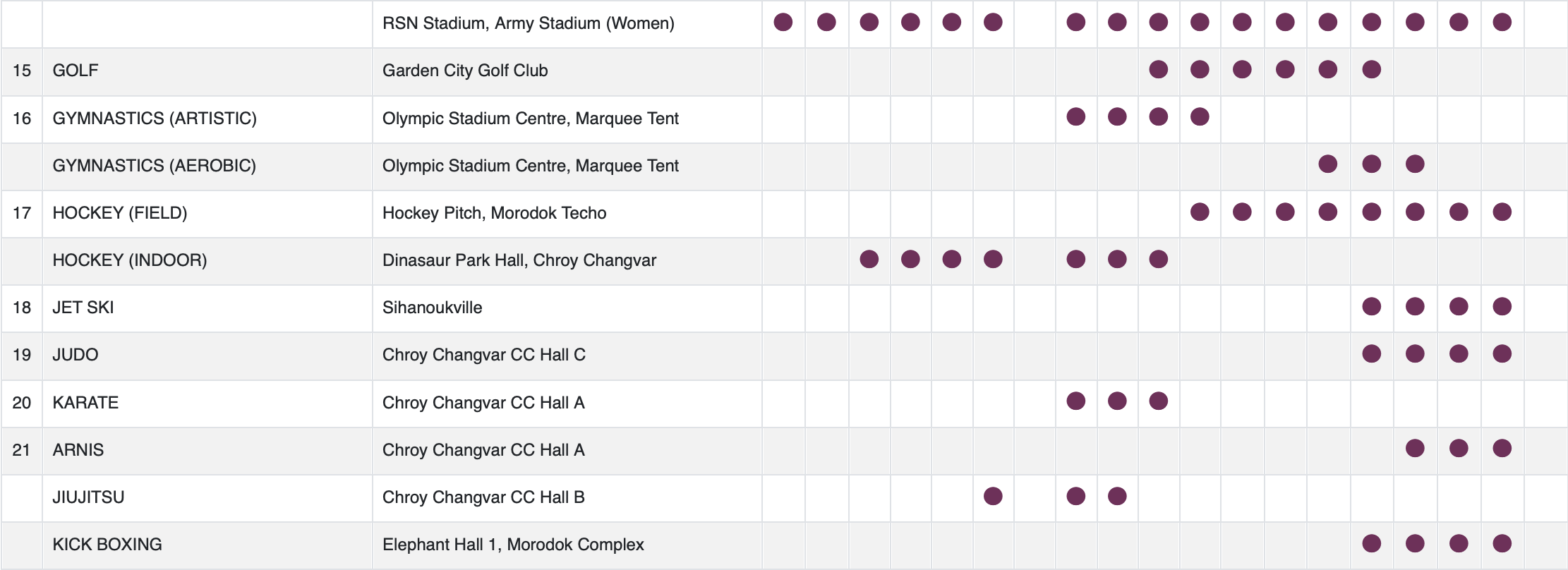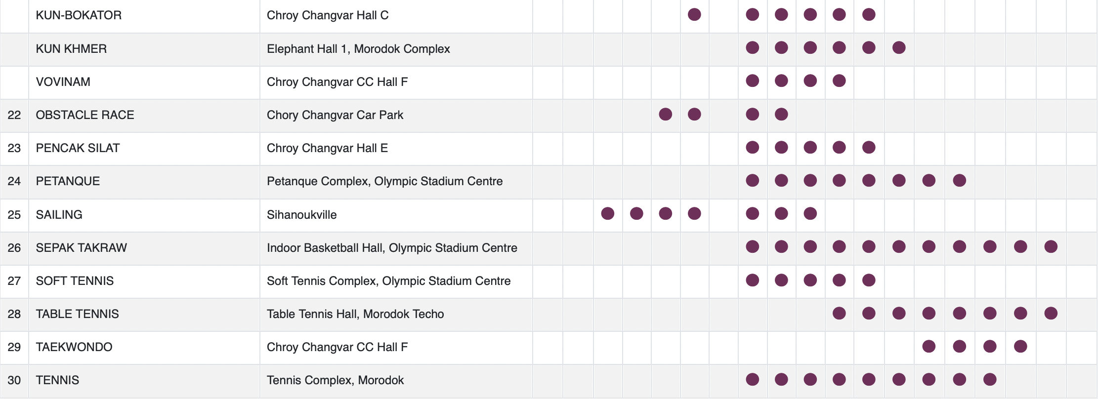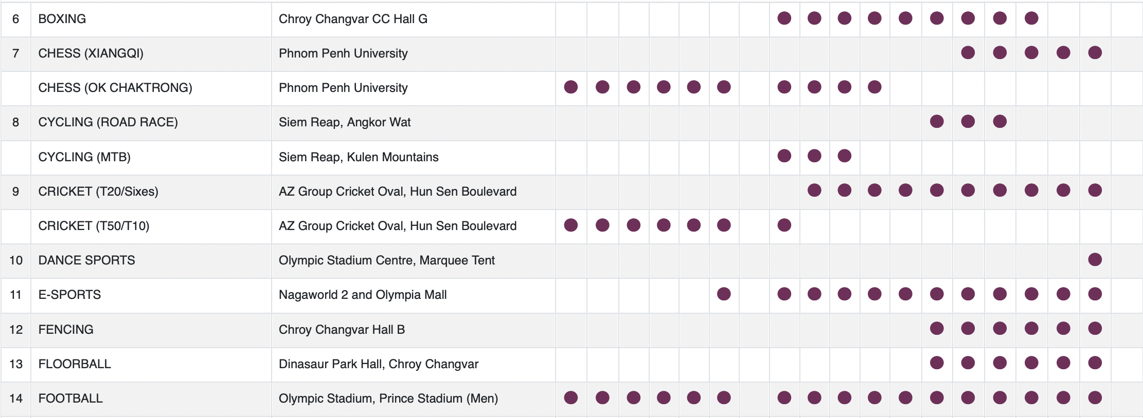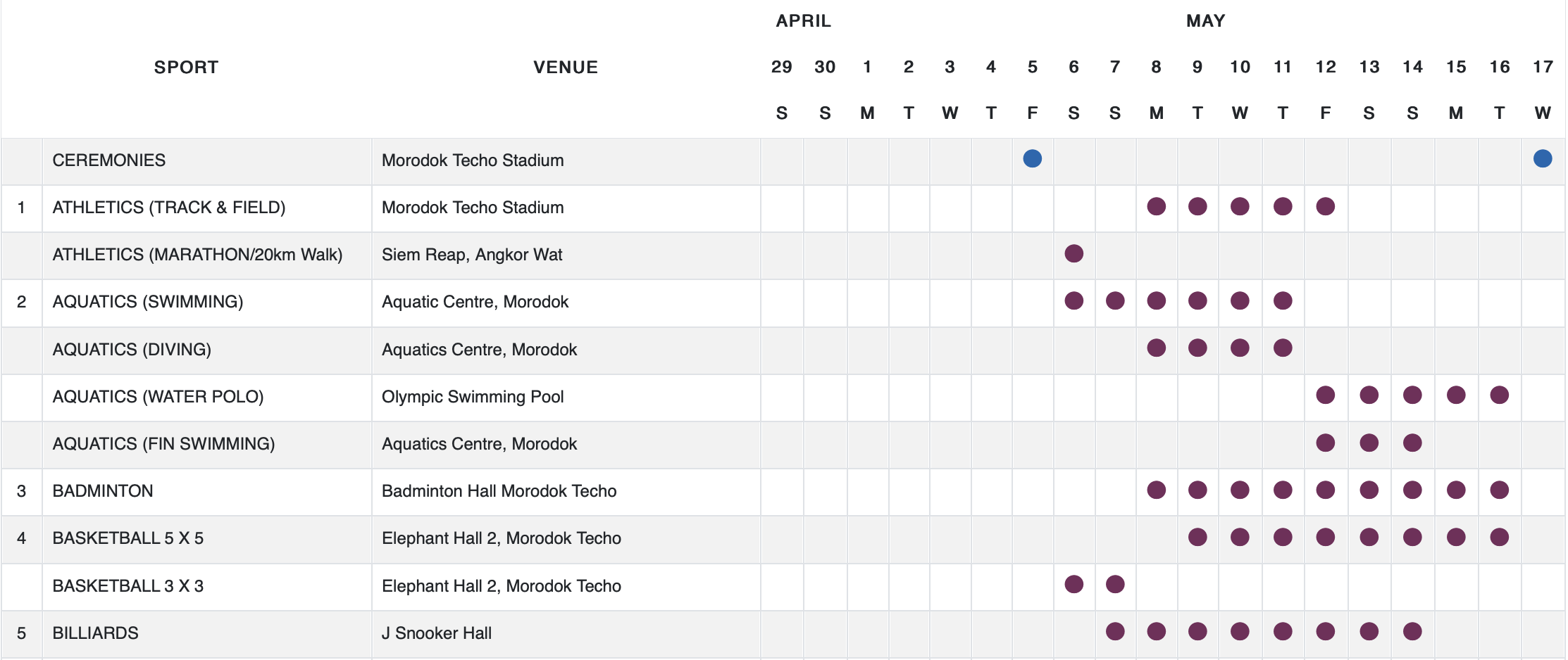 Trong số này, Phnom Penh sẽ tổ chức phần lớn các môn thi đấu của đại hội, cũng là nơi đặt làng vận động viên SEA Games có sức chứa 3.500 người.