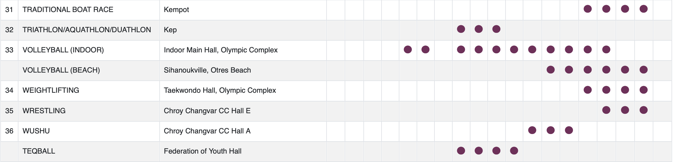 Đại hội Thể thao Đông Nam Á (SEA Games 32) diễn ra từ ngày 5.5 đến 17.5 tại Campuchia, bao gồm các tỉnh, thành là Phnom Penh, Siem Reap, Preah Sihanouk, Kep và Kampot.