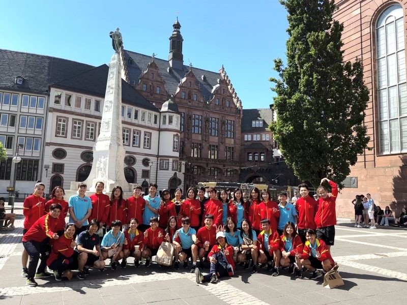 | Đội tuyển nữ Việt Nam chụp ảnh chung khi tham quan thành phố Frankfurt. Ảnh: VFF |