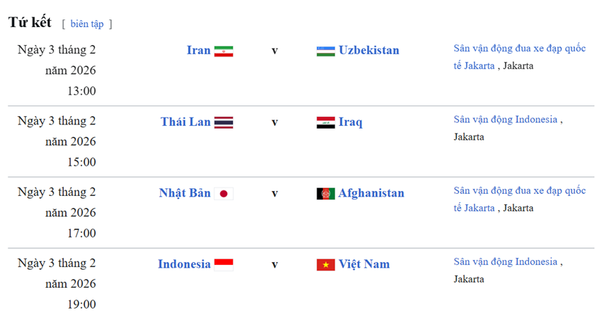| Lịch thi đấu vòng tứ kết Giải vô địch futsal châu Á 2026. |