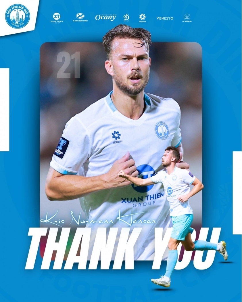 CLB Thép Xanh Nam Định vừa đưa ra thông báo về việc chấm dứt hợp đồng với tiền vệ Kristoffer Normann Hansen, khép lại quãng thời gian ngắn ngủi của cầu thủ người Na Uy tại đội chủ sân Thiên Trường.