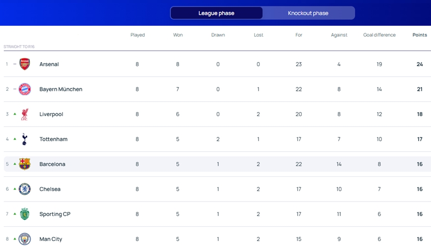 | Bảng xếp hạng Top 8 giai đoạn phân hạng của Cúp C1 châu Âu. Ảnh: UEFA |
