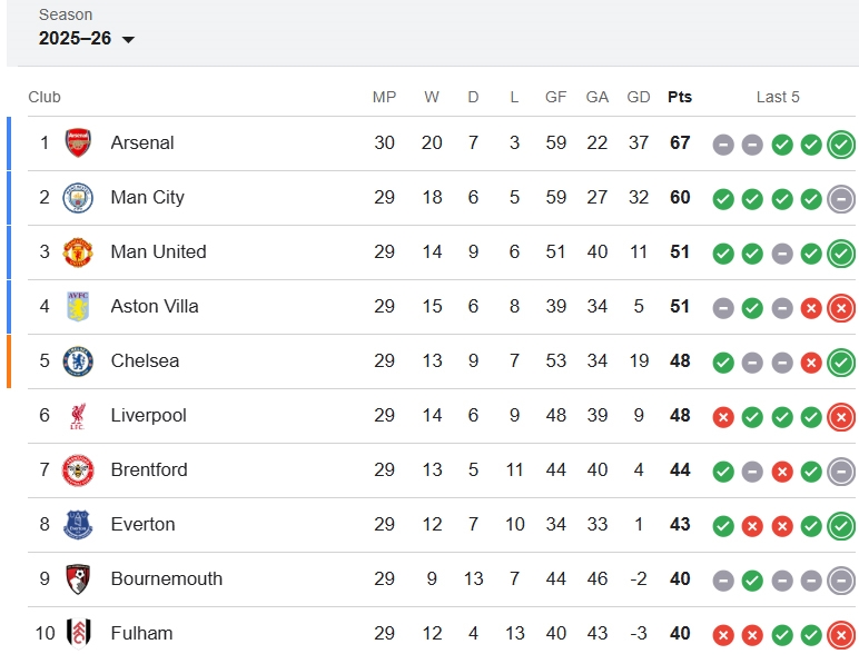 Kết quả này trở nên ý nghĩa hơn bao giờ hết khi ở trận đấu cùng giờ, Man City bất ngờ bị cầm hòa 2-2 bởi Nottingham Forest ngay trên sân nhà. Với 3 điểm nhọc nhằn tại Amex, Arsenal chính thức nới rộng khoảng cách với đối thủ trực tiếp lên thành 7 điểm, tạo ra lợi thế cực lớn trong cuộc đua vô địch Ngoại hạng Anh năm nay.