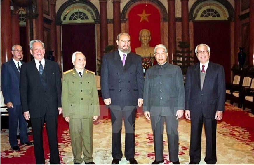 Bí thư thứ nhất Ban Chấp hành Trung ương Đảng Cộng sản Cuba, Chủ tịch Hội đồng Nhà nước và Hội đồng Bộ trưởng nước Cộng hòa Cuba Fidel Castro với Tổng Bí thư Đỗ Mười, Chủ tịch nước Lê Đức Anh, Thủ tướng Võ Văn Kiệt và Đại tướng Võ Nguyên Giáp tại Phủ Chủ tịch tối 8-12-1995. Ảnh tư liệu: TTXVN |