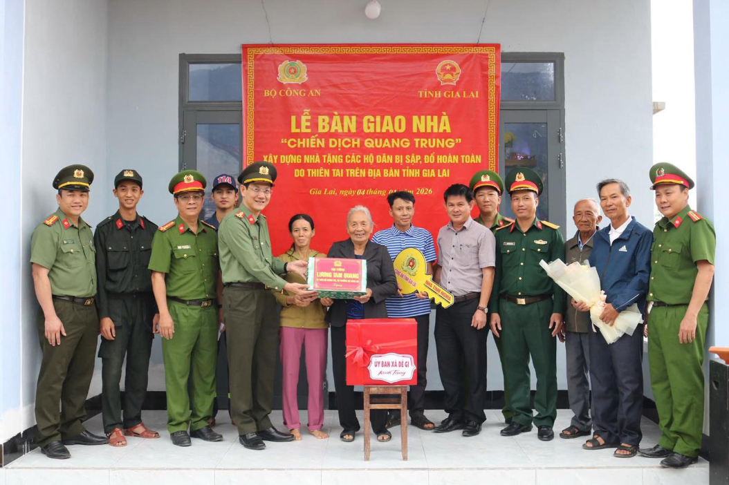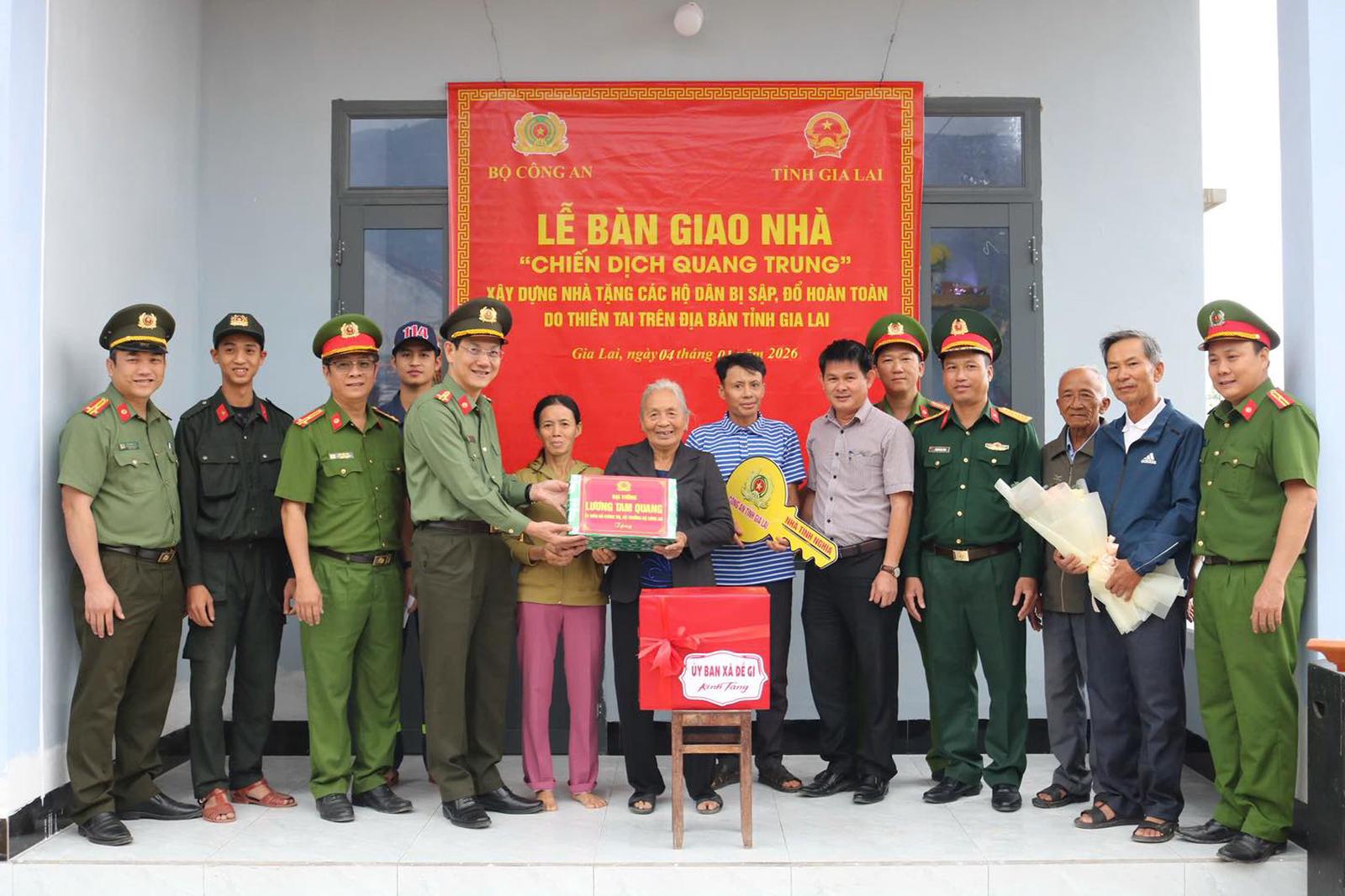 Lãnh đạo Công an tỉnh Gia Lai bàn giao nhà và tặng quà người dân. Ảnh: Cổng TTĐT Gia Lai
