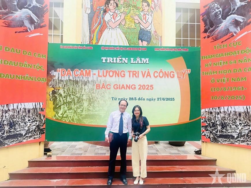 Báo Quân đội nhân dân đã tạo điều kiện để tác giả (bên phải) tác nghiệp tại triển lãm “Da cam - Lương tri và Công lý” tại tỉnh Bắc Giang (nay là Bắc Ninh). |