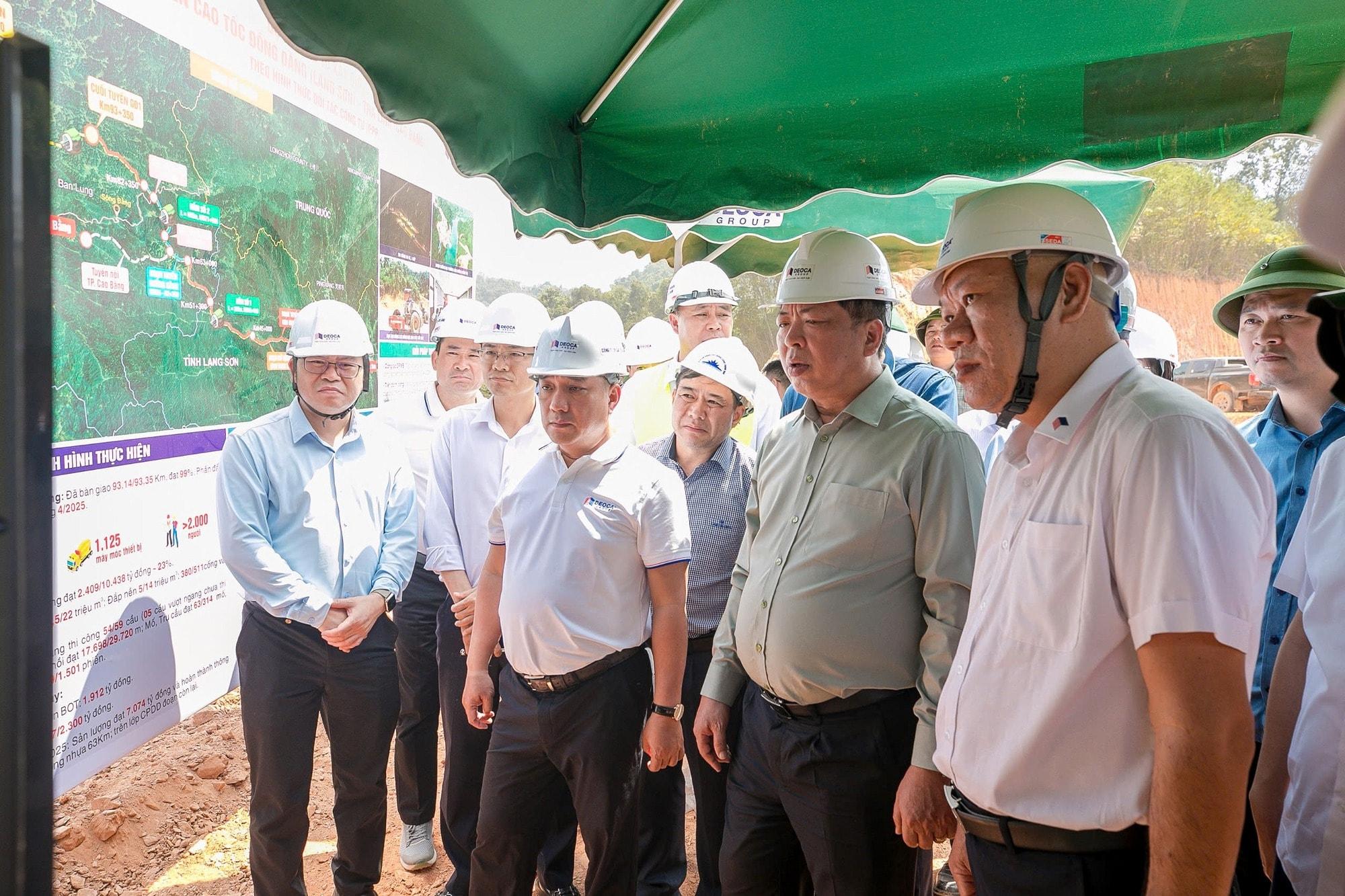 Báo cáo với đoàn kiểm tra tại vị trí cầu Km79+250 bắc qua sông Bằng thuộc dự án cao tốc Đồng Đăng - Trà Lĩnh, đại diện nhà đầu tư cho biết nhằm đảm bảo mục tiêu thông tuyến trong năm 2025, doanh nghiệp dự án và các nhà thầu đã huy động hơn 2.200 nhân sự cùng 1.141 máy móc, thiết bị, triển khai 216 mũi thi công trên toàn tuyến. Đến nay, sản lượng thi công dự án đạt 2.409/10.438 tỷ đồng (tương đương 23% giá trị hợp đồng).