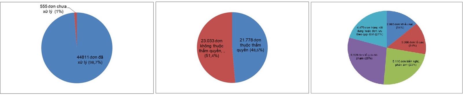 Lực lượng Công an các cấp đã tiếp nhận 45.366 đơn các loại, trong đó, đã xử lý 44.811 đơn (đạt 98,7%). Trong tổng số đơn đã xử lý, có 23.033 đơn không thuộc trách nhiệm giải quyết của lực lượng Công an (chiếm 51.4%), 21.778 đơn thuộc trách nhiệm giải quyết của lực lượng CAND (chiếm 48.6%), gồm: 5.110 đơn kiến nghị, phản ánh; 6.128 đơn tố giác tội phạm; 2.993 đơn khiếu nại; 3.068 đơn tố cáo; có 4.479 đơn trùng nội dung hoặc đơn lưu theo quy định.