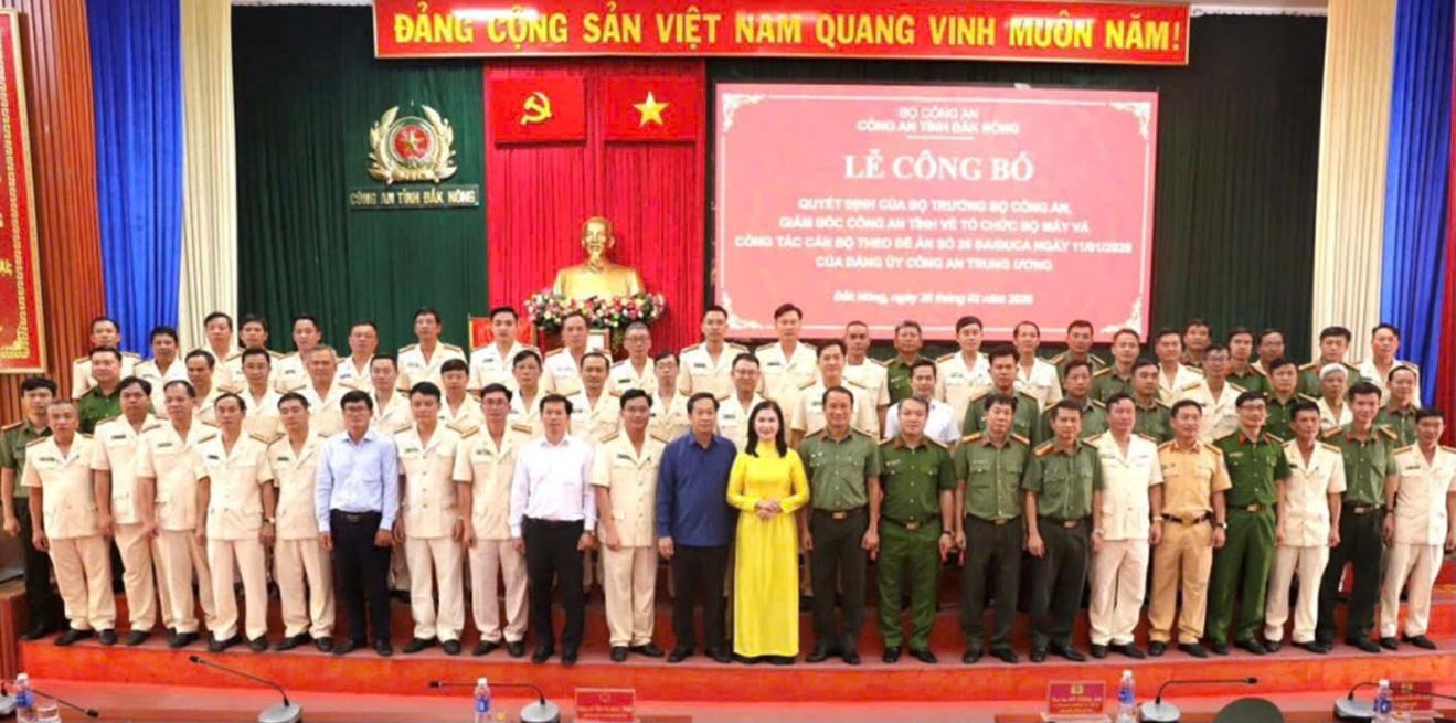 Từ 0 giờ ngày 1/3/2025, cùng với lực lượng công an cả nước, Công an tỉnh Đắk Nông đã triển khai mô hình tổ chức mới theo Đề án số 25-ĐA/ĐUCA ngày 11/1/2025 của Đảng ủy Công an Trung ương với việc bỏ cấp trung gian, không tổ chức công an cấp huyện và tiếp nhận thêm 4 nhiệm vụ mới từ các sở, ngành gồm: Nhiệm vụ sát hạch, cấp giấy phép lái xe cơ giới đường bộ; nhiệm vụ về lý lịch tư pháp và dịch vụ công cấp phiếu lý lịch tư pháp; nhiệm vụ về an toàn, an ninh thông tin mạng và nhiệm vụ về cai nghiện ma túy và quản lý sau cai nghiện ma túy.