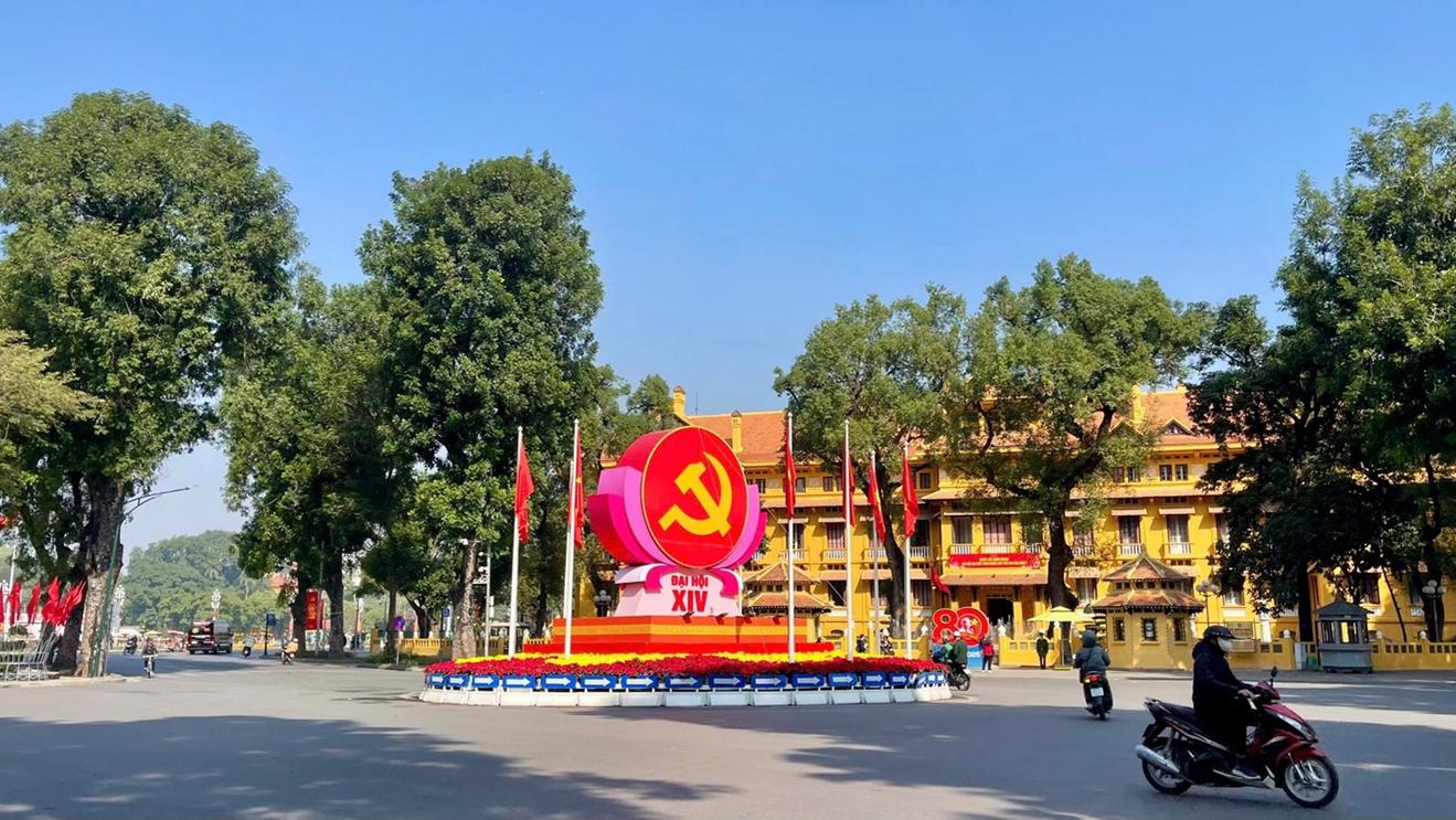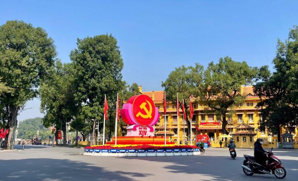 Biểu tượng Đại hội XIV của Đảng nổi bật, lan tỏa khí thế phấn khởi trước sự kiện chính trị trọng đại của đất nước. Ảnh: Việt Hà.