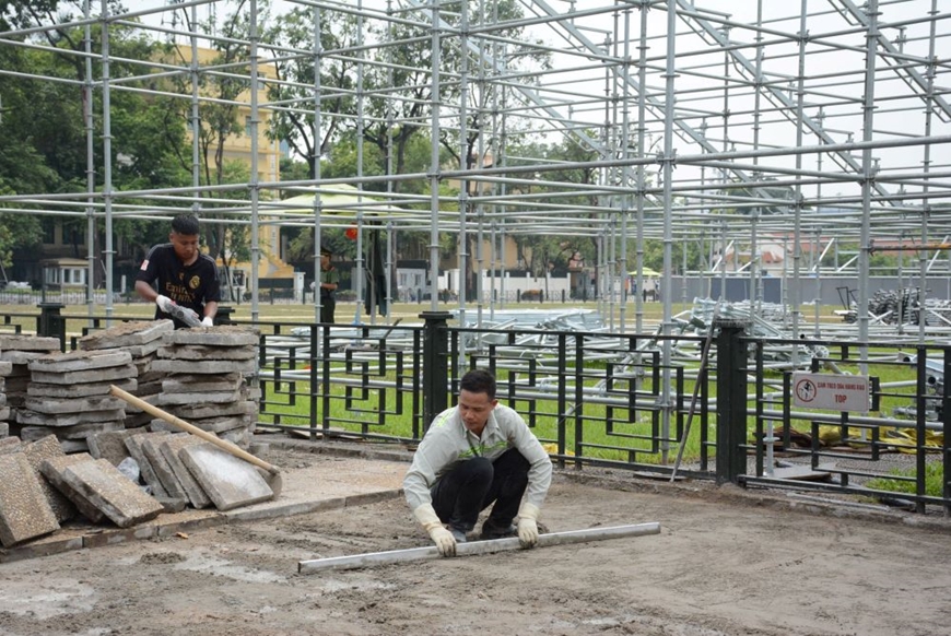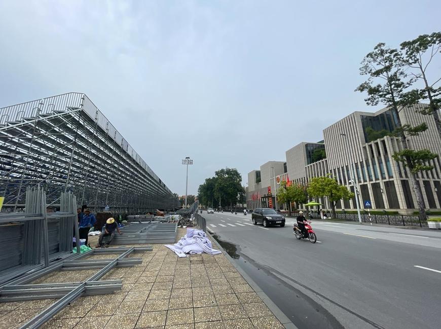 | Hệ thống sân khấu được dựng tại Quảng trường Ba Đình, đối diện Nhà Quốc hội. |