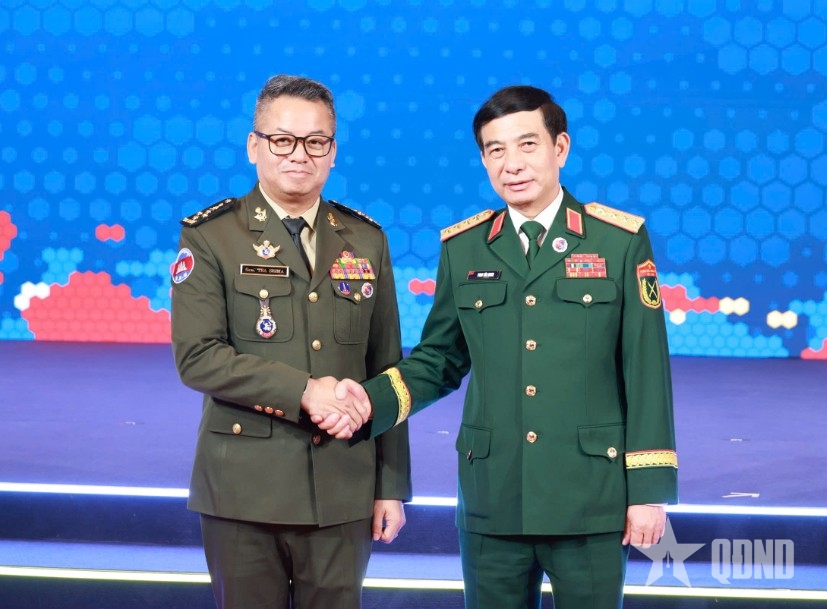 | Đại tướng Phan Văn Giang tiếp xúc với Bộ trưởng Bộ Quốc phòng Campuchia Tea Seiha. |