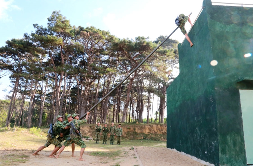 Bộ đội Sư đoàn 2 huấn luyện vượt tường cao. Ảnh: TUYÊN HUẤN |