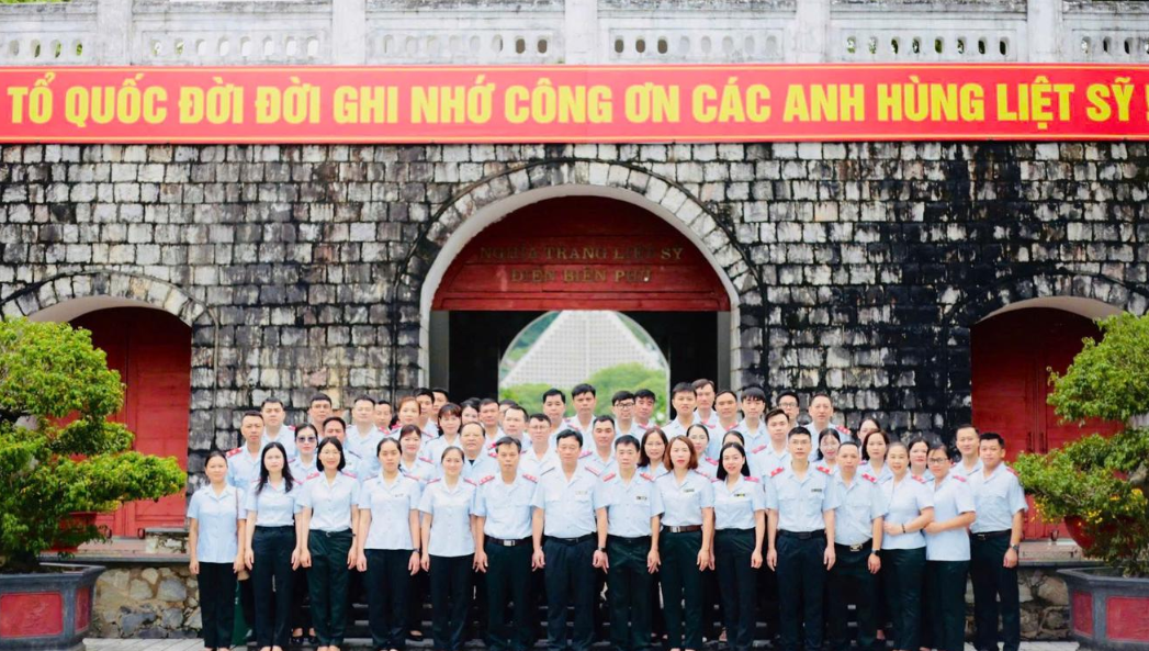 Tập thể cán bộ, công chức, người lao động Thanh tra tỉnh Điện Biên chụp ảnh lưu niệm sau khi viếng các Anh hùng liệt sĩ tại Nghĩa trang A1. Ảnh: ĐB