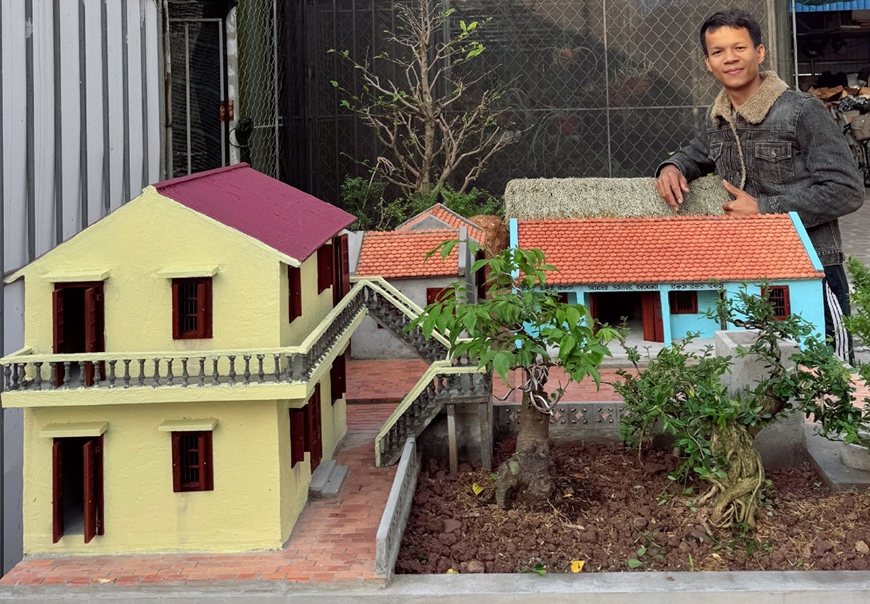 | Nguyễn Văn Tiên bên mô hình nhà mới hoàn thành. Ảnh do nhân vật cung cấp |