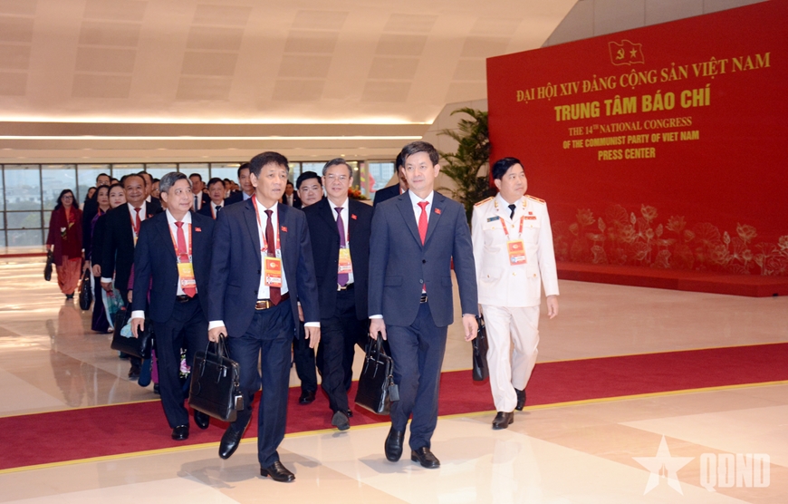 Các đại biểu tiến vào hội trường thực hiện chương trình ngày làm việc thứ ba, Đại hội XIV của Đảng.