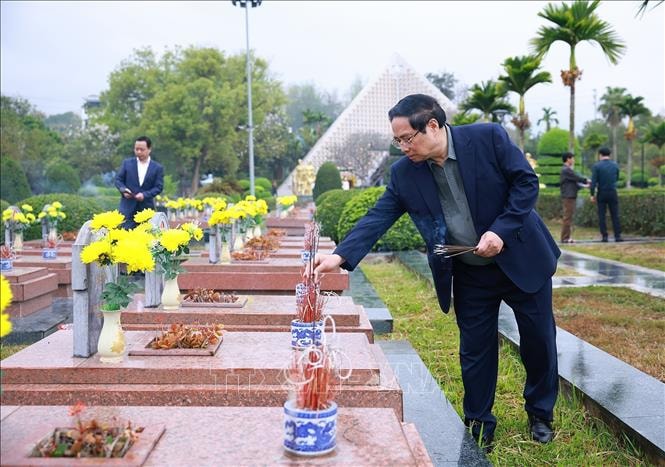 Thủ tướng Phạm Minh Chính thắp hương trên phần mộ các Anh hùng liệt sĩ tại Nghĩa trang Liệt sĩ quốc gia A1. Ảnh: Dương Giang/TTXVN