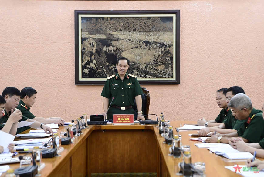 | Thượng tướng Vũ Hải Sản, Ủy viên Trung ương Đảng, Thứ trưởng Bộ Quốc phòng chủ trì cuộc làm việc. |