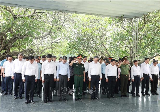 Trong không khí trang nghiêm, Tổng Bí thư Tô Lâm và Đoàn công tác đã thành kính dâng hoa, dâng hương tưởng nhớ và bày tỏ lòng biết ơn vô hạn Chủ tịch Hồ Chí Minh - Anh hùng Giải phóng dân tộc Việt Nam, nhà văn hóa kiệt xuất; tưởng nhớ Đại tướng Võ Nguyên Giáp - người anh cả của Quân đội nhân dân Việt Nam, cùng cán bộ, chiến sĩ, thanh niên xung phong, dân công hỏa tuyến, quân và dân cả nước đã anh dũng chiến đấu, hy sinh làm nên chiến thắng “lừng lẫy năm châu, chấn động địa cầu”.