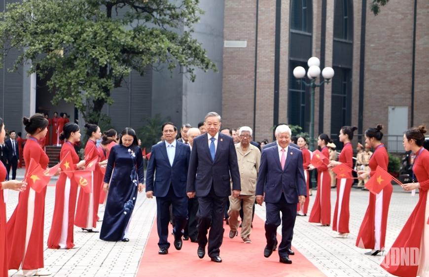 Tổng Bí thư Tô Lâm, Thủ tướng Chính phủ Phạm Minh Chính, lãnh đạo Đảng, Nhà nước tới dự đại hội. |