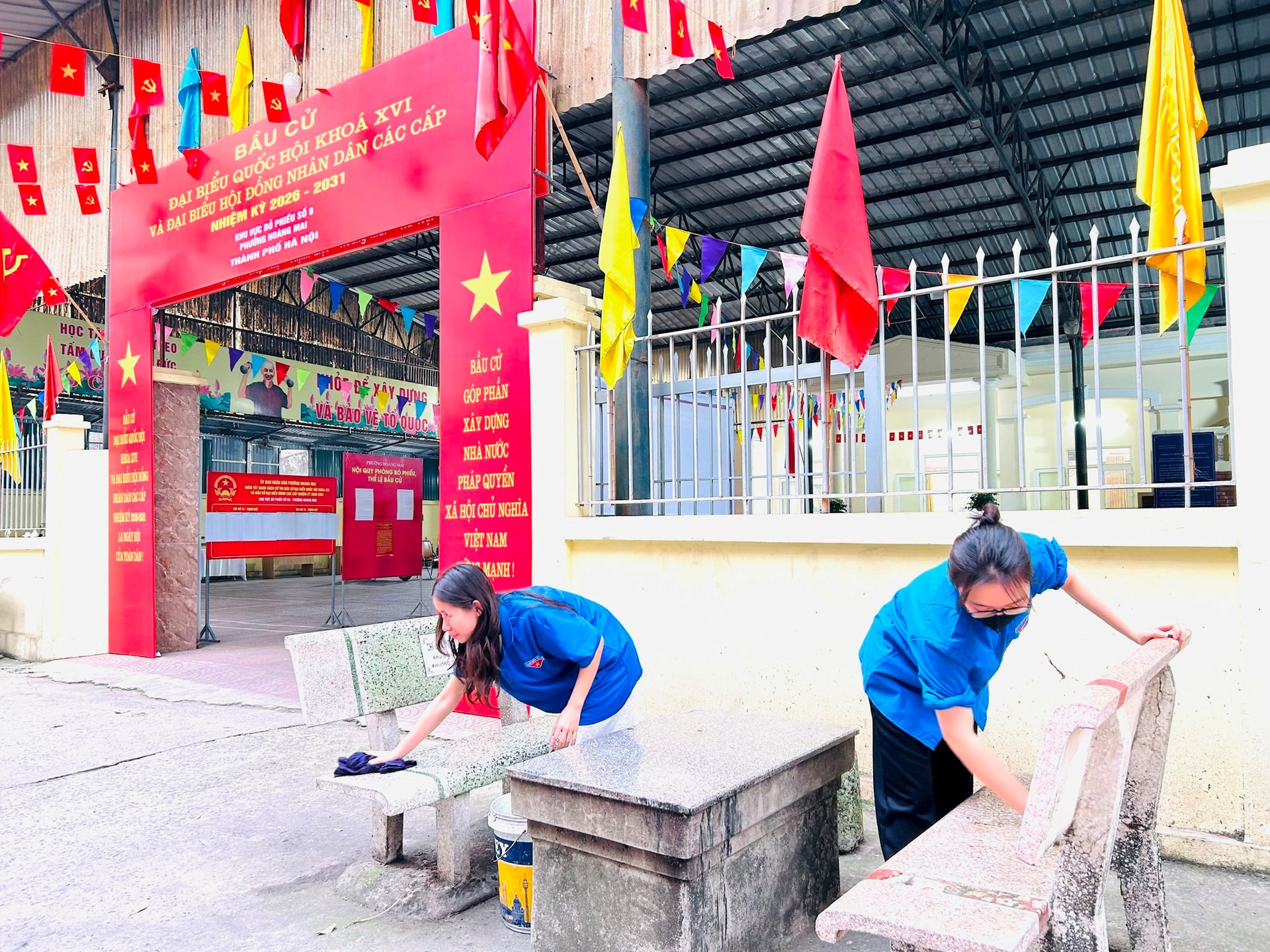 Các đoàn viên lau bàn ghế đá để cử tri đi bầu cử có thể ngồi nghỉ ngơi. Ảnh: Trần Oanh