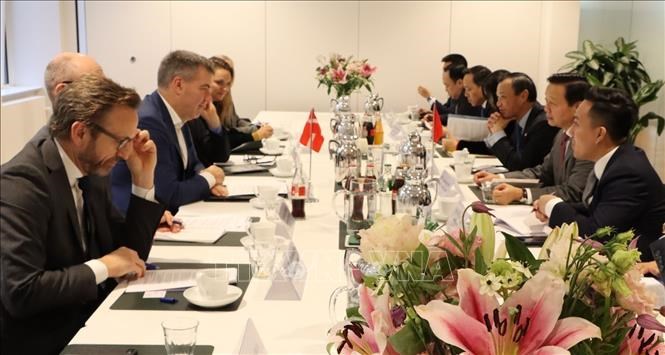 Phó thủ tướng Chính phủ Trần Hồng Hà gặp Bộ trưởng Khí hậu, Năng lượng và Tiện ích Đan Mạch Lars Aagaard, sáng 26-11 tại thủ đô Copenhagen. Ảnh: TTXVN |