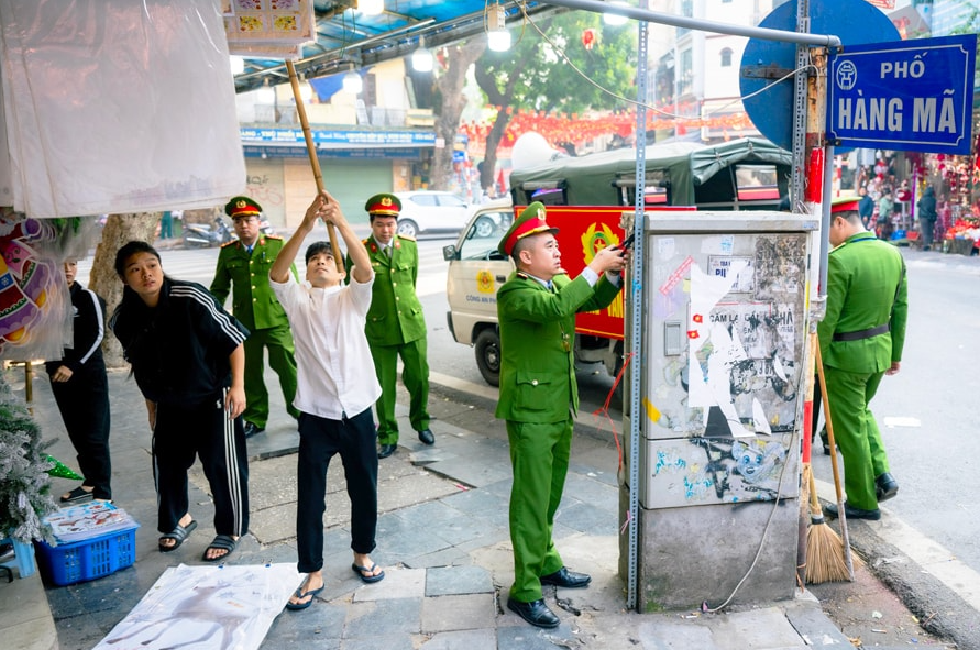 Lực lượng chức năng phường Hoàn Kiếm xử lý vi phạm trật tự đô thị trên phố Hàng Mã. Ảnh: Như Hoàn